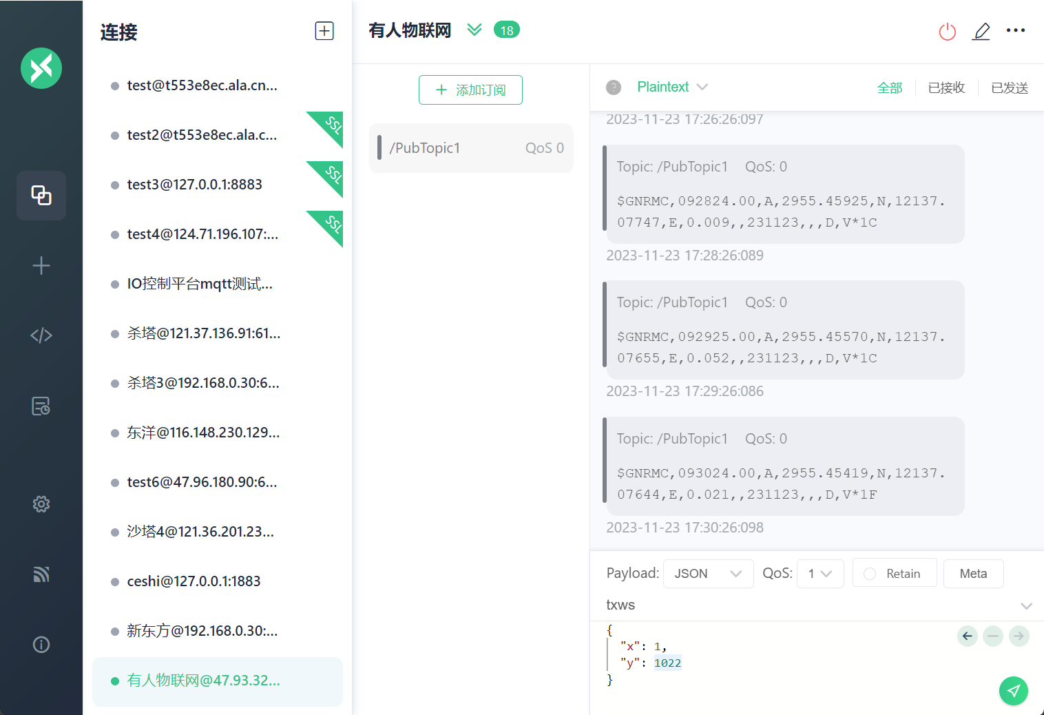 設(shè)備鏈接GPS天線可以放在室外空曠位置,在MQTT.X查看定位數(shù)據(jù)。