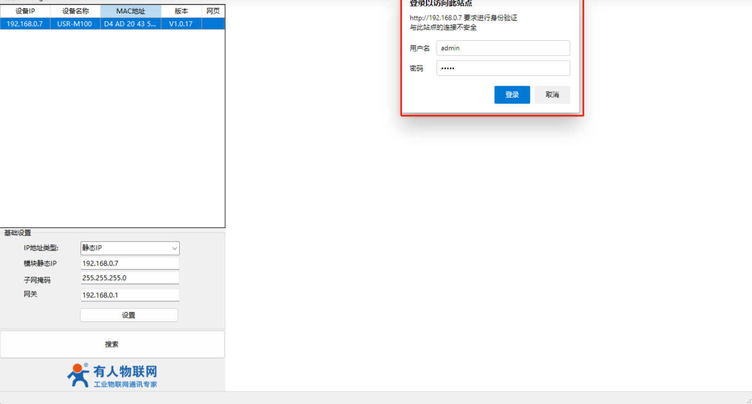 M100網(wǎng)口可以和PC鏈接同一個上級路由,在同網(wǎng)段使用MXX軟件搜索設(shè)備(此案例M100和PC鏈接同一路由器測試)