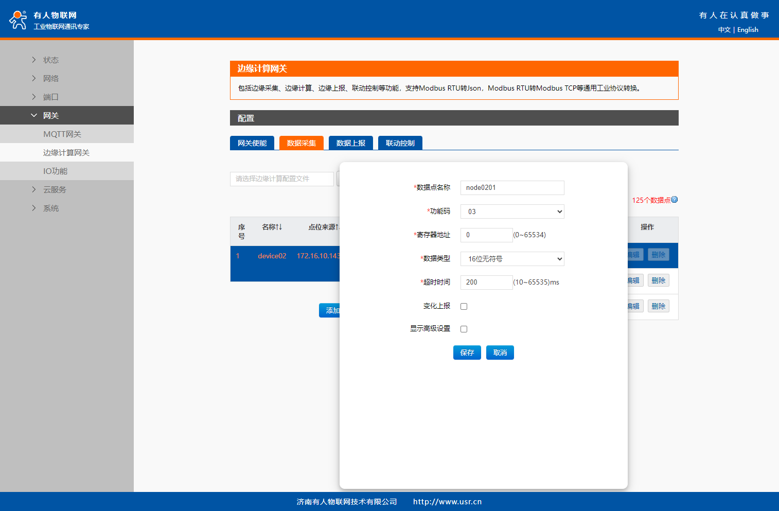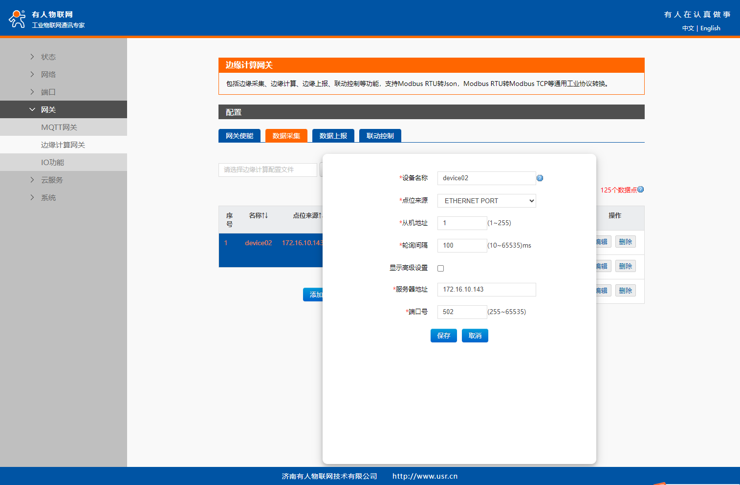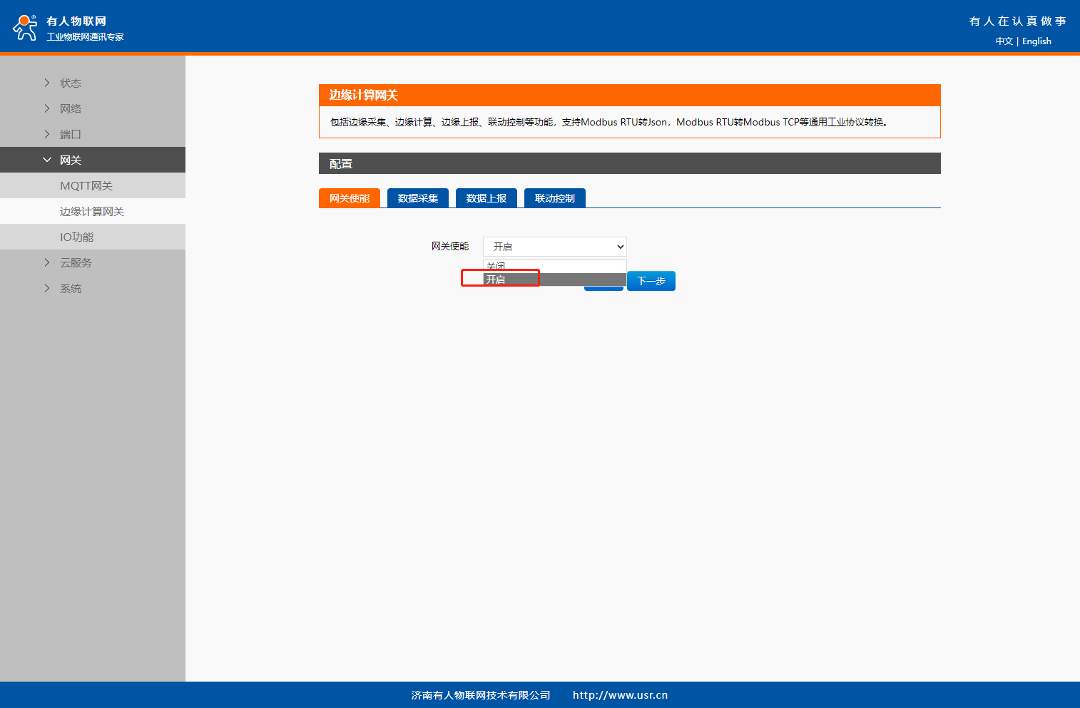 在“網(wǎng)關(guān)”-“邊緣計算”界面中開啟網(wǎng)關(guān)使能,點擊“下一步”在“數(shù)據(jù)采集界面”配置modbusTCP的數(shù)據(jù)點。