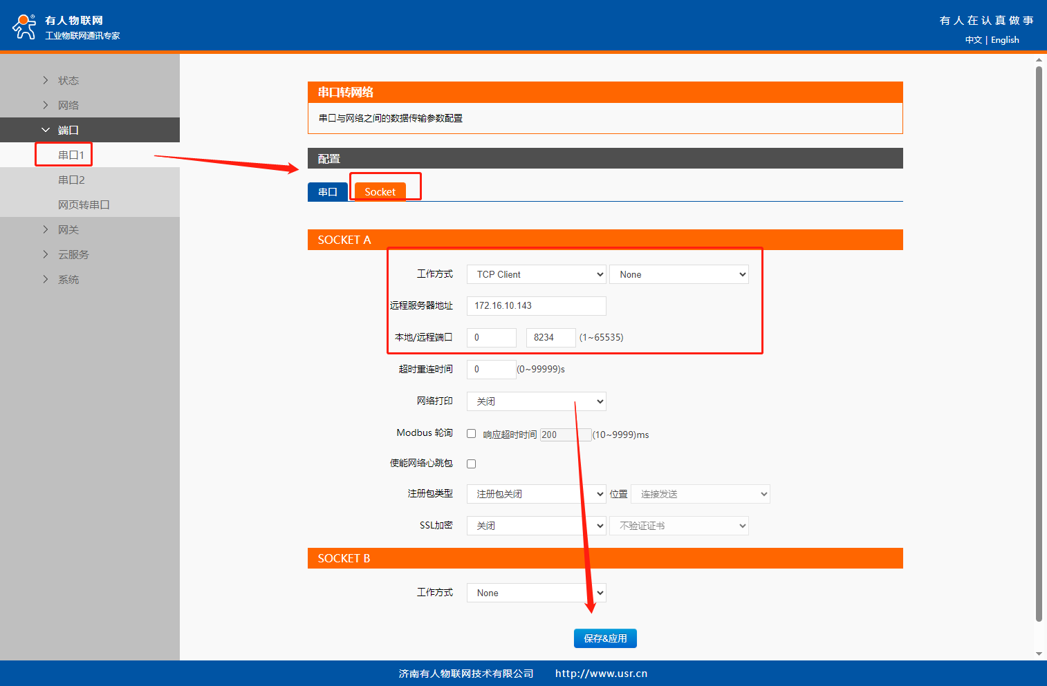 本案例測試服務(wù)器為我司 TCP服務(wù)器測試,用戶測試時請在“端口”>“串口1” >“ Socket”界面配置自己TCP服務(wù)器的參數(shù)。