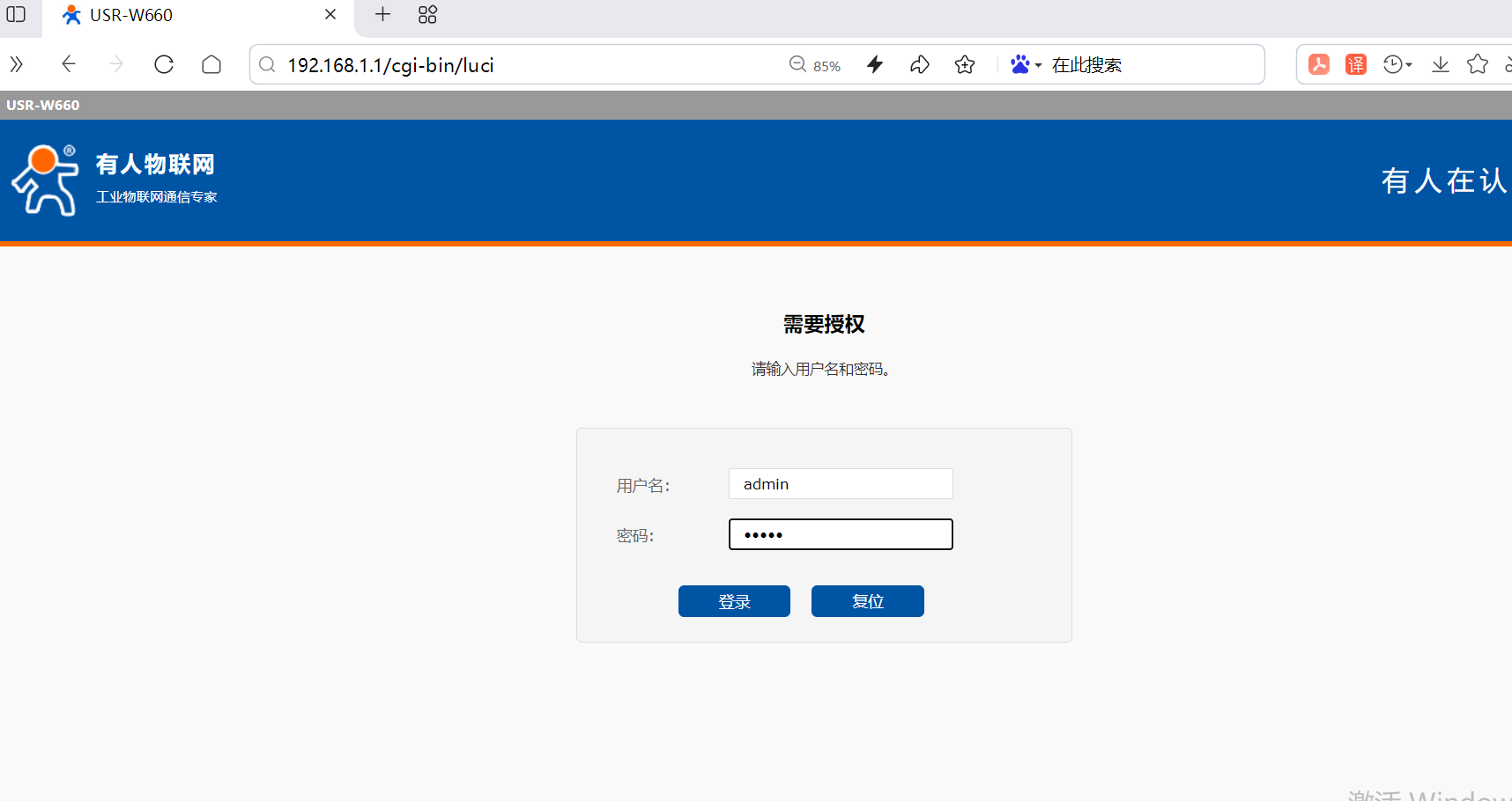 2、在瀏覽器輸入W660默認(rèn)IP :192.168.1.1。用戶名密碼都為admin