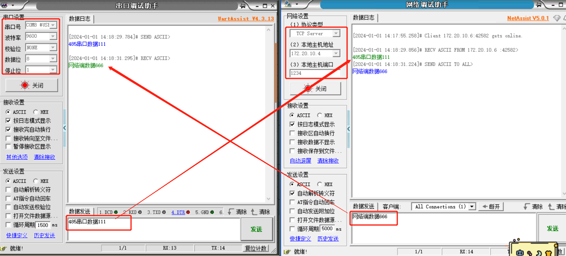 然后打開串口和網(wǎng)絡(luò)調(diào)試助手進(jìn)行數(shù)據(jù)測(cè)試