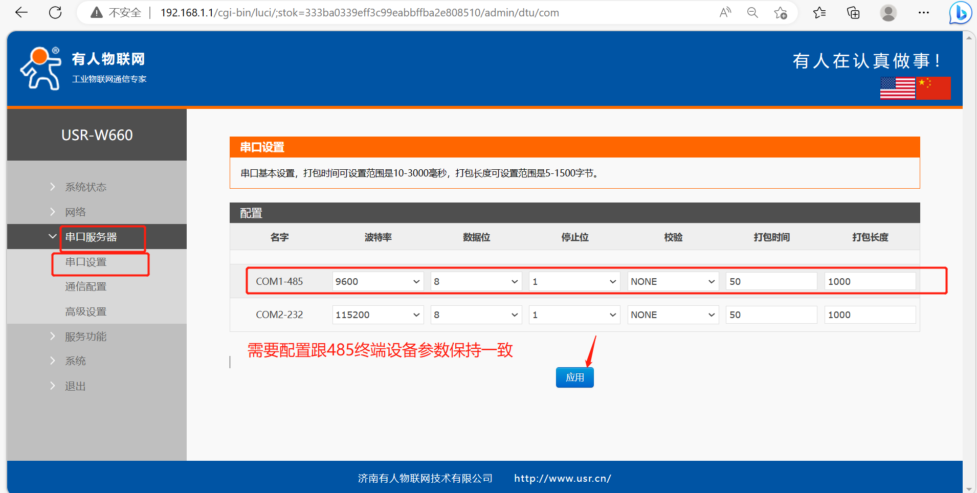 4、打開“串口服務(wù)器”---“串口配置”---配置串口參數(shù)與終端設(shè)備保持一致