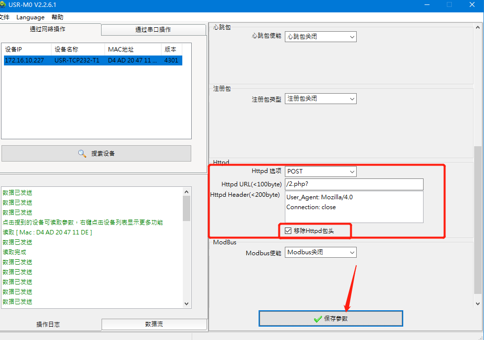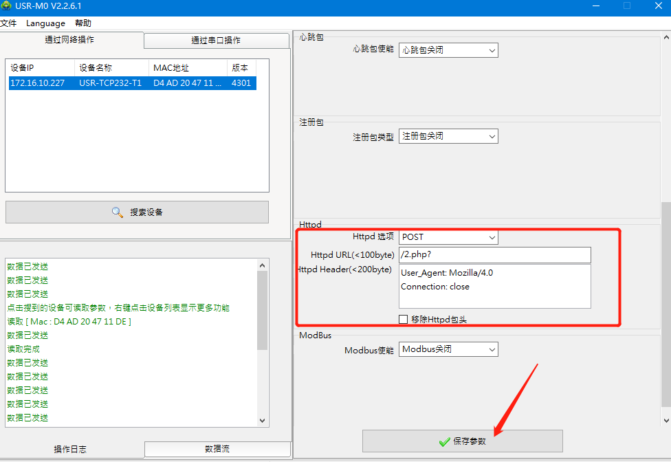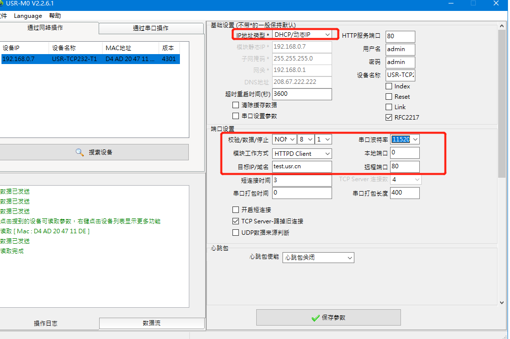 4.IP設(shè)置為DHCP,模塊設(shè)置為Httpd Client模式,請求方式POST,URL為/2.php?,設(shè)置服務(wù)器地址test.usr.cn,端口80,設(shè)置并保存所有參數(shù),重啟模塊。(本說明文檔使用為有人測試服務(wù)器)
