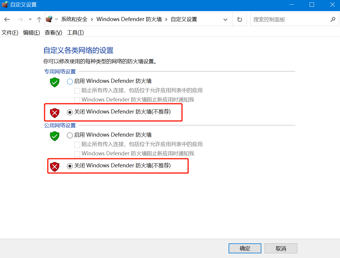 從控制面板---系統(tǒng)與安全---Windows防火墻,關(guān)閉防火墻并禁用與本次測試無關(guān)的網(wǎng)卡。并關(guān)閉電腦殺毒軟件。