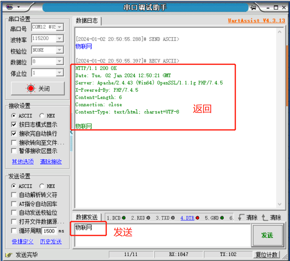 5.如果不勾選“移除httpd包頭”,從串口發(fā)送物聯(lián)網(wǎng),會看到服務(wù)器返回的包頭和數(shù)據(jù)
