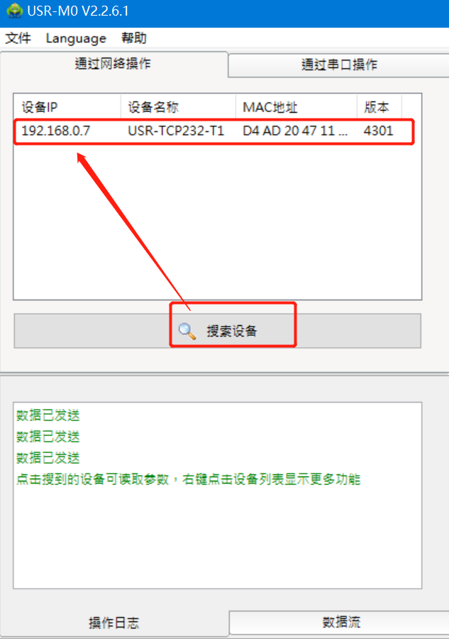 3.點擊“搜索設(shè)備”當(dāng)搜索列表中出現(xiàn)T1的設(shè)備后,單擊搜索到的設(shè)備,配置其參數(shù)
