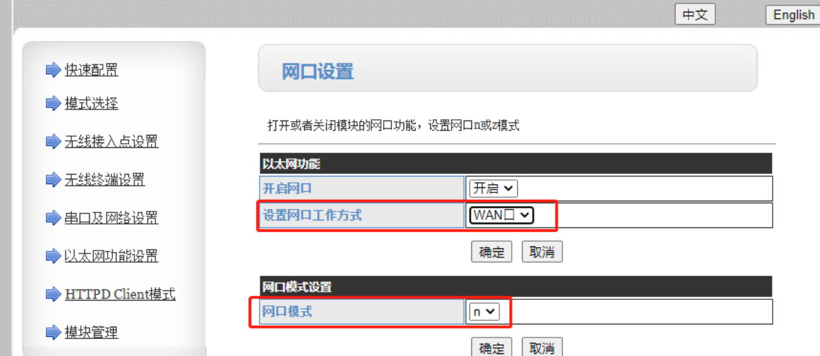 2、以太網(wǎng)功能設(shè)置:設(shè)置網(wǎng)口工作模式為WAN口,先不要重啟設(shè)備,等所有參數(shù)設(shè)置完成后一起重啟。