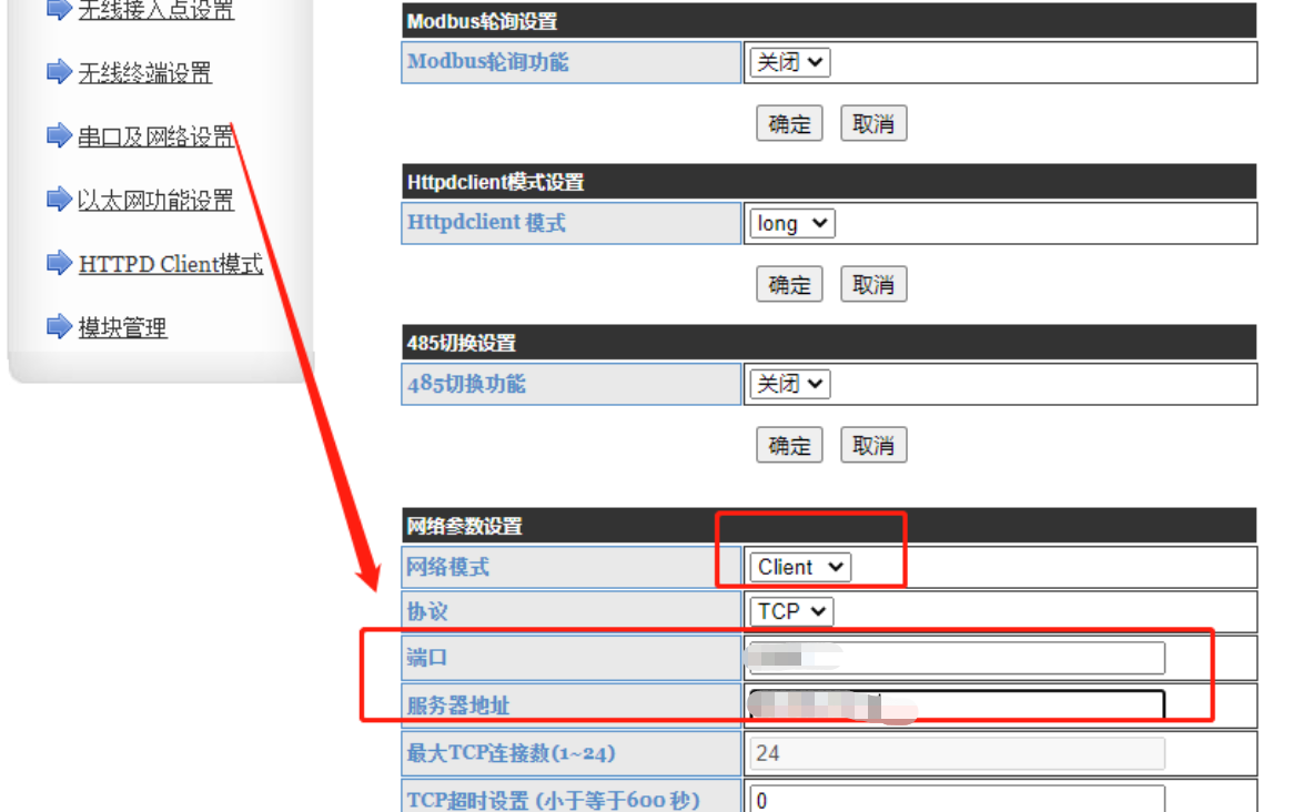 4、串口及網(wǎng)絡(luò)設(shè)置:網(wǎng)絡(luò)參數(shù)設(shè)置---設(shè)置TCP連接,DR404做client工作模式下,服務(wù)器地址和端口就是server的本機(jī)IP和本地端口。