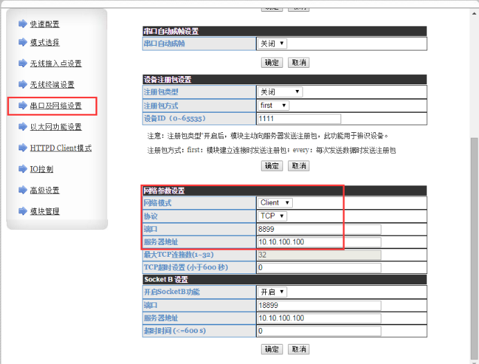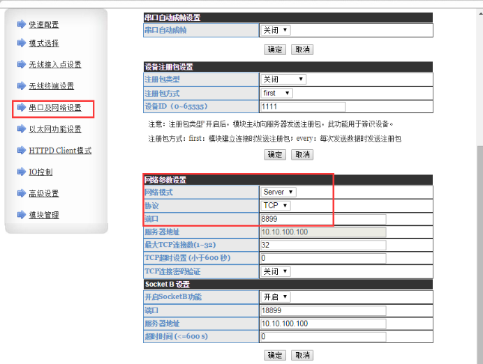 1:進入配置網(wǎng)頁10.10.100.254(登錄帳號和密碼默認為admin),在串口及網(wǎng)絡設置中設置網(wǎng)絡模式為TCP server,端口8899 。點擊確定,重啟模塊。