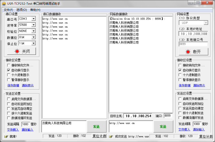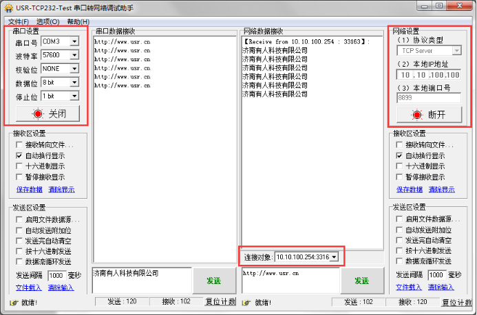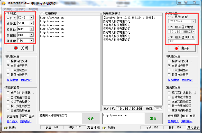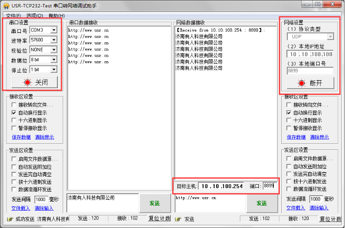 3.通信測試,串口向網(wǎng)絡發(fā)送及網(wǎng)絡向串口發(fā)送均可正常收到。