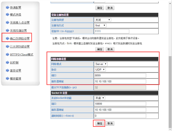 1.在串口及網(wǎng)絡設置中設置網(wǎng)絡模式為UDP server,端口8899 。點擊確定,重啟模塊。