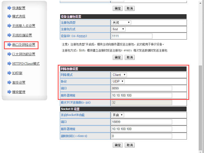 1.在串口及網(wǎng)絡設置中設置網(wǎng)絡模式為UDP Client,端口8899 。點擊確定,重啟模塊。