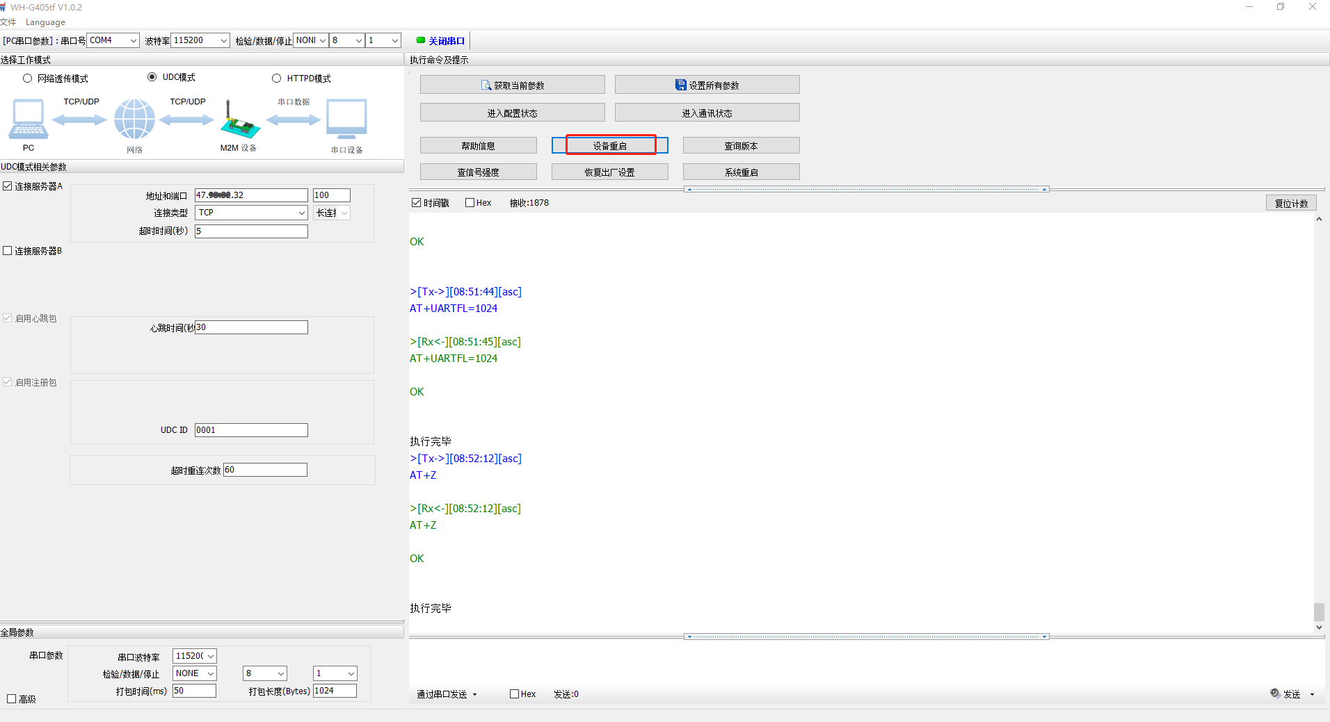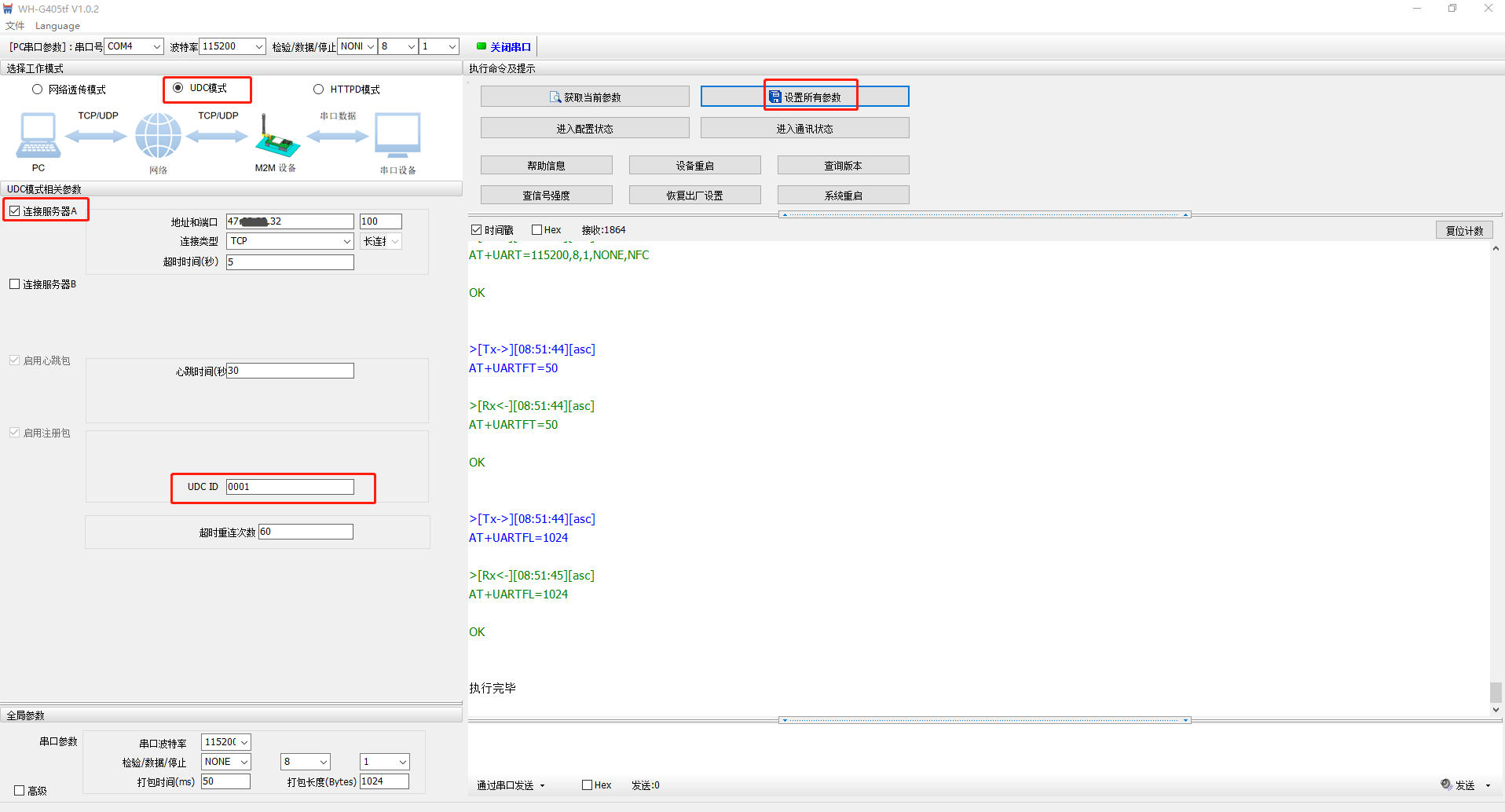 4、選擇UDC模式,勾選連接服務(wù)器A,地址設(shè)置要連接的遠(yuǎn)程服務(wù)器地址,端口100,連接類型TCP,長連接。UDC ID用0001。設(shè)置完參數(shù),點(diǎn)擊設(shè)置所有參數(shù),點(diǎn)擊設(shè)備重啟。