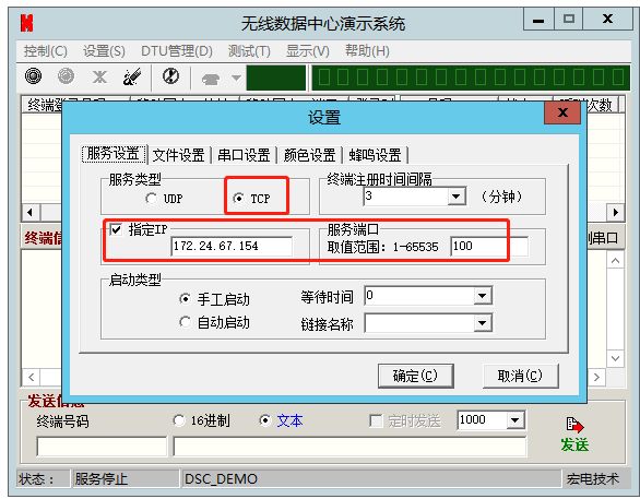 2、點(diǎn)擊設(shè)置,點(diǎn)擊服務(wù)設(shè)置,服務(wù)類型勾選TCP,勾選指定IP,輸入遠(yuǎn)程服務(wù)器對應(yīng)的服務(wù)器IP,服務(wù)端口用100,點(diǎn)擊確定。