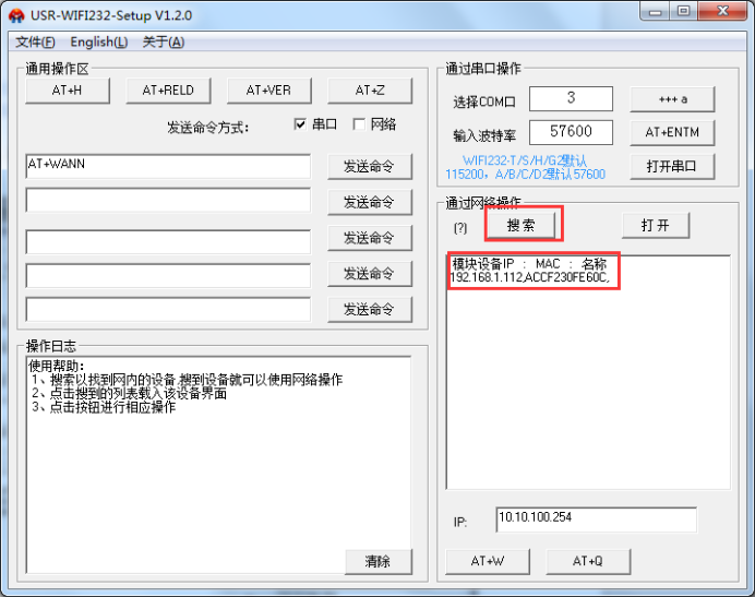 1.通過(guò)網(wǎng)絡(luò)搜索。局域網(wǎng)內(nèi)電腦,打開(kāi)USR-WIFI232-Setup軟件(直接點(diǎn)擊軟件名稱可以進(jìn)入下載鏈接),點(diǎn)擊搜索,即可看到模塊的IP。