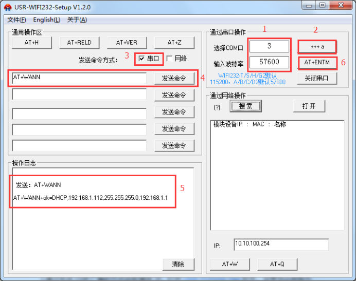 2.通過(guò)串口讀取。模塊串口連接電腦,打開(kāi)USR-WIFI232-Setup軟件(直接點(diǎn)擊軟件名稱可以進(jìn)入下載鏈接),選擇COM口和波特率,發(fā)送+++ a(成功會(huì)返回+ok,沒(méi)有返回的話請(qǐng)檢查硬件連接及串口線),發(fā)送命令方式選擇串口,發(fā)送AT+WANN查詢,查詢結(jié)束后要點(diǎn)擊AT+ENTM返回通訊。