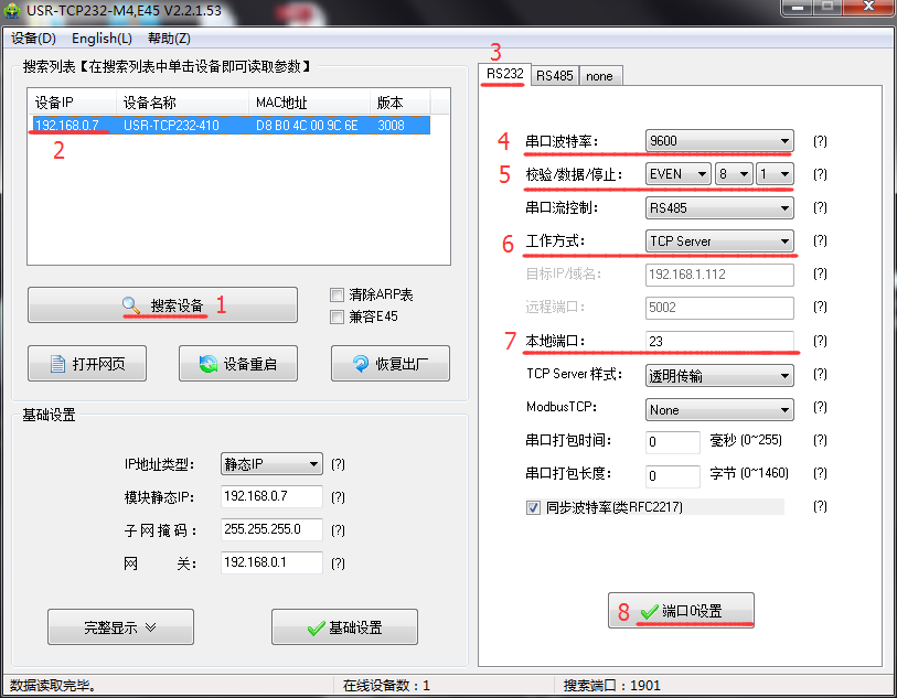 使用設(shè)置軟件設(shè)置參數(shù):搜索設(shè)備,設(shè)置串口服務(wù)器的IP地址與局域網(wǎng)網(wǎng)段一致,設(shè)置串口服務(wù)器的波特率為9600,校驗(yàn)數(shù)據(jù)位停止位:EVEN 8 1。