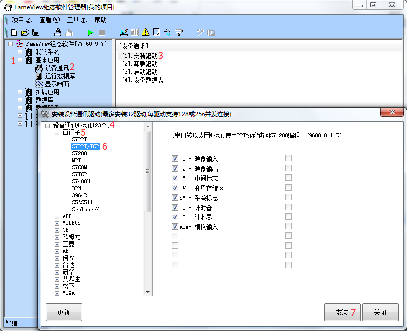d)基本應(yīng)用--設(shè)備通訊--安裝驅(qū)動(dòng)--設(shè)備通訊驅(qū)動(dòng)--西門(mén)子--S7PPI/TCP--安裝