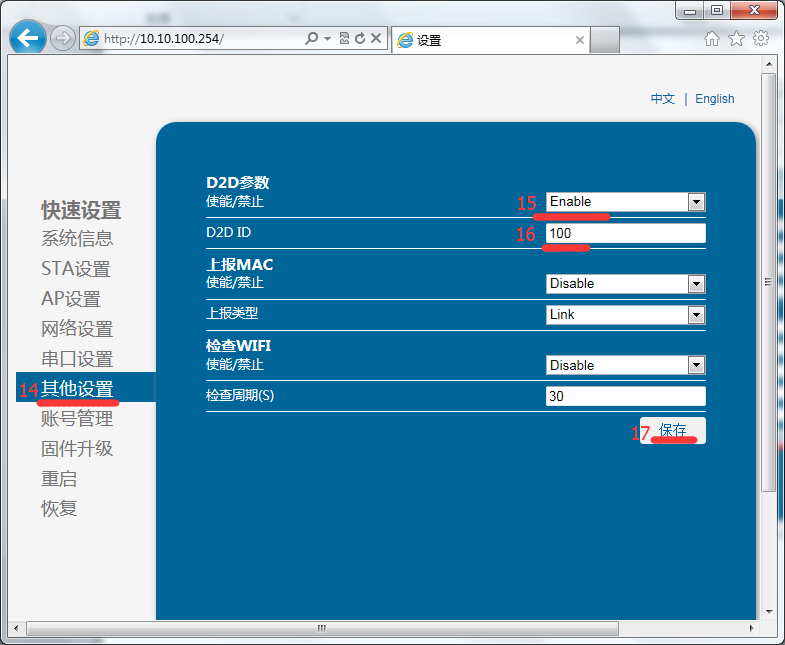 b)打開瀏覽器(推薦使用IE),輸入10.10.100.254,賬戶密碼為admin。進(jìn)入模塊網(wǎng)頁(yè)之后,參數(shù)做如下設(shè)置。