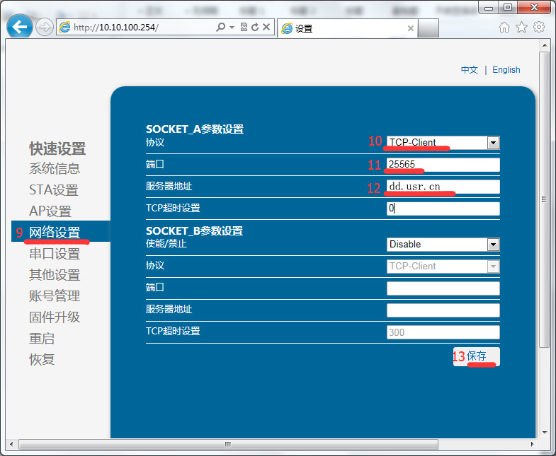 c)將模塊工作方式改為TCP Client,服務(wù)器地址dd.usr.cn,服務(wù)器端口25565。