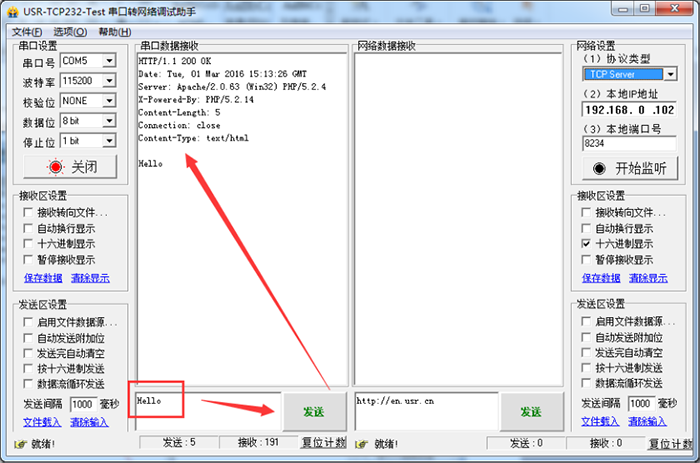 6、將WiFi模塊的串口連接到電腦串口,使用串口調(diào)試助手發(fā)送提交數(shù)據(jù),返回ok表示測試成功。