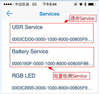 5、點(diǎn)擊需要進(jìn)行通信的藍(lán)牙名稱建立連接,此時(shí)USR-BLE100上的LINK燈變?yōu)槌A?。軟件界面如下所示,點(diǎn)擊USR Service。