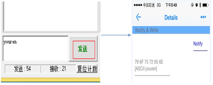 串口助手發(fā)送youren,手機(jī)APP接收到數(shù)據(jù)如下圖所示。