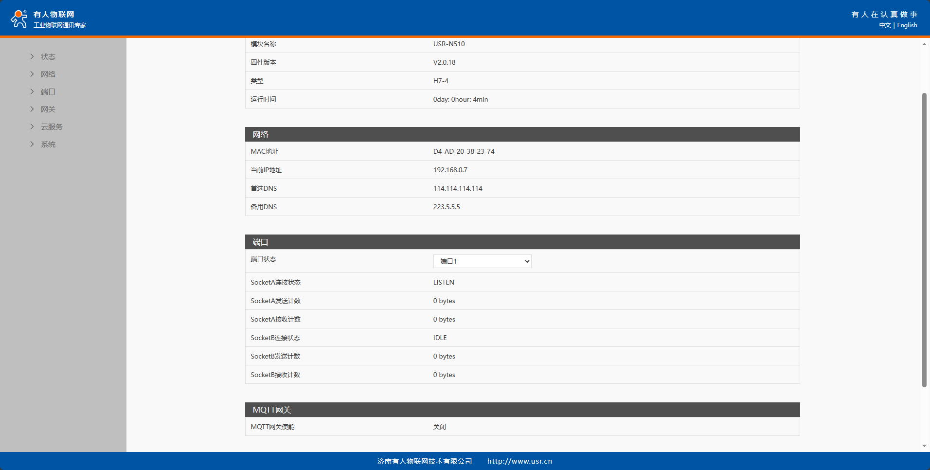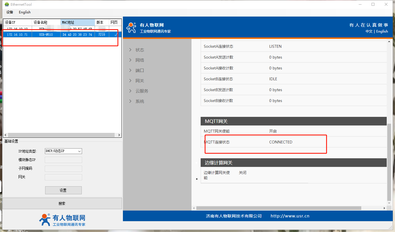 保存并應(yīng)用參數(shù),在系統(tǒng)中重啟設(shè)備。將設(shè)備的網(wǎng)口和電腦插入同一個(gè)路由器。打開N510設(shè)備的內(nèi)置網(wǎng)頁,點(diǎn)擊搜索,我們可以看到路由器給N510設(shè)備此時(shí)分配的ip地址。雙擊ip可以進(jìn)入到配置界面。在狀態(tài)下我們可以進(jìn)一步看到mqtt的鏈接狀態(tài)