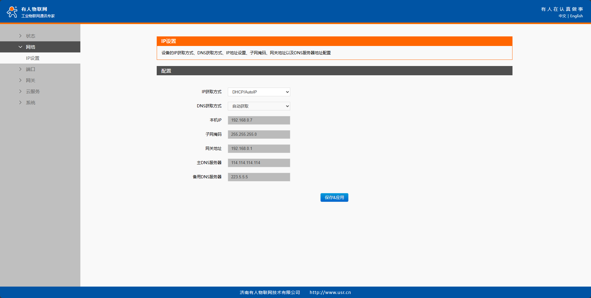 進(jìn)入內(nèi)置網(wǎng)頁,在網(wǎng)絡(luò)---ip設(shè)置中將設(shè)置的ip地址改為DHCP或者給N510設(shè)備配置一個(gè)靜態(tài)ip地址(地址需要改為與上級(jí)路由器同網(wǎng)段并且未被占用的ip地址)本案例采用dhcp動(dòng)態(tài)獲取方式測(cè)試。