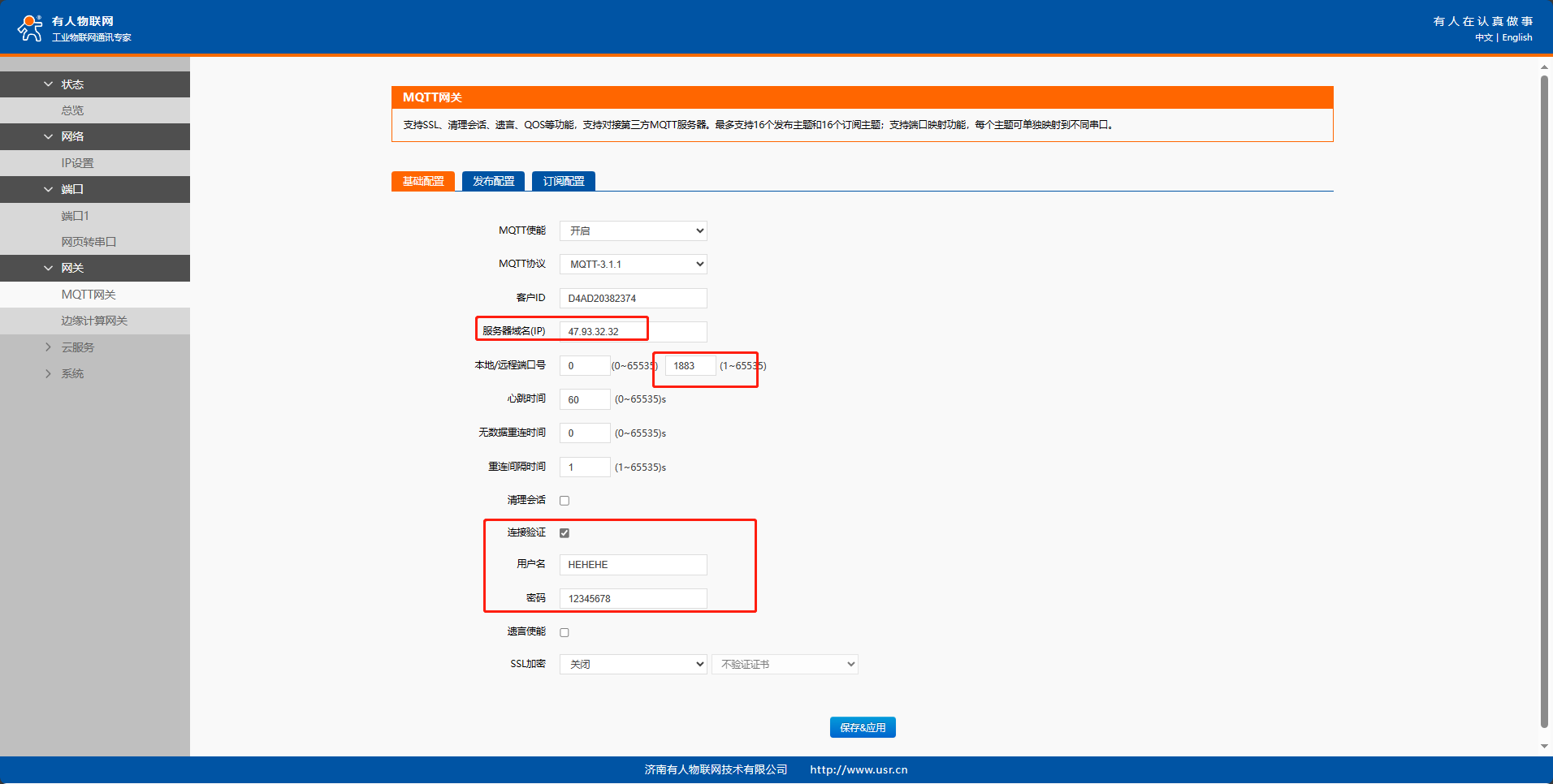 打開網(wǎng)關(guān)--MQTT網(wǎng)關(guān)界面,開啟MQTT使能,進(jìn)一步配置mqtt服務(wù)器相關(guān)參數(shù)。注:客戶ID盡量避免123456等常規(guī)數(shù)字,可以使用設(shè)備mac來代替。