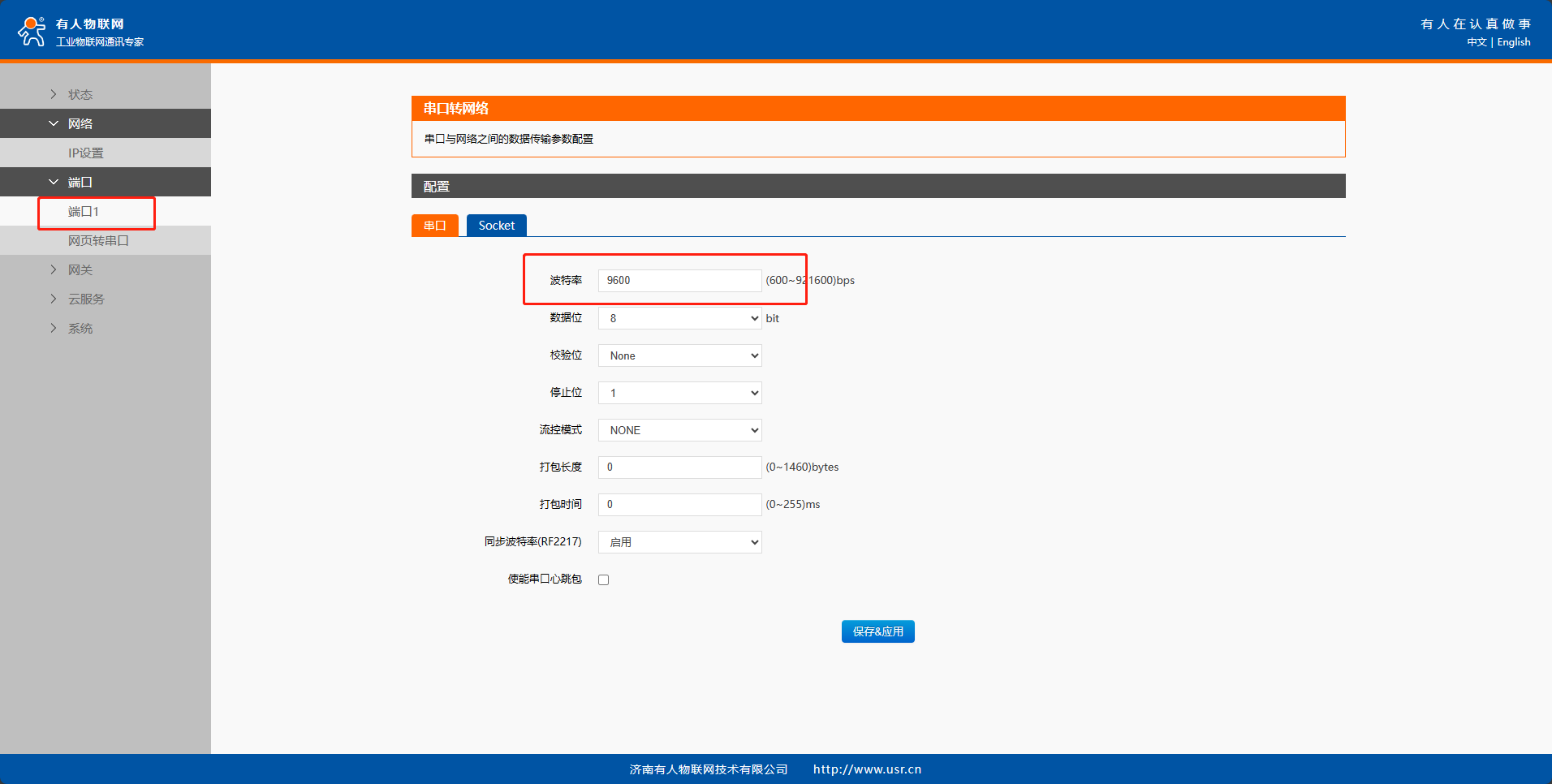 找到端口---端口1設(shè)置,根據(jù)現(xiàn)場(chǎng)實(shí)際應(yīng)用的串口設(shè)備對(duì)串口參數(shù)做修改,串口參數(shù)需要跟串口所接的實(shí)際485設(shè)備做匹配。此案例以9600波特率舉例。