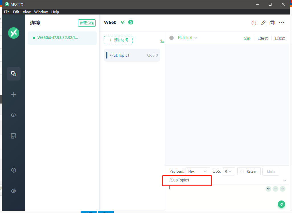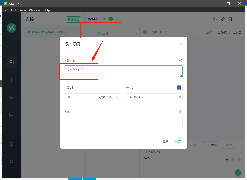 在MQTTX軟件添加訂閱主題,訂閱主題填寫模組的發(fā)布主題,發(fā)布主題填寫模組的訂閱主題。