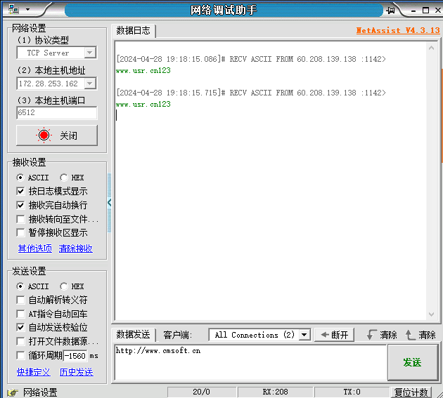 登陸遠(yuǎn)程桌面連接,打開一個(gè)網(wǎng)絡(luò)助手,協(xié)議類型TCP server,服務(wù)器IP,本地端口6512和USR-N510一樣,點(diǎn)擊連接。
