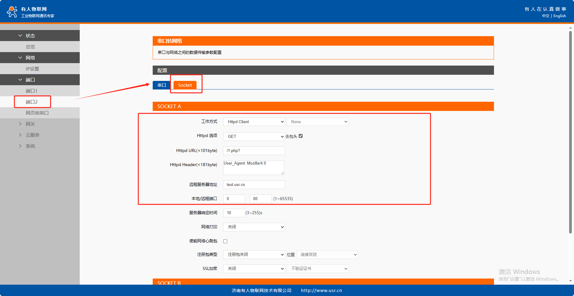 模塊設(shè)置參數(shù):打開(kāi)設(shè)置軟件,模塊設(shè)置為Httpd Client模式,請(qǐng)求方式GET,URL為/1.php?,設(shè)置服務(wù)器地址test.usr.cn,端口80,設(shè)置并保存所有參數(shù),重啟模塊。(本說(shuō)明文檔使用為有人測(cè)試服務(wù)器)