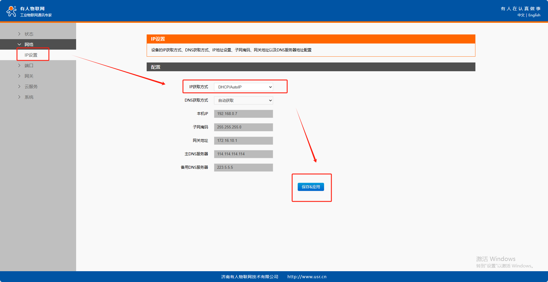 4、IP地址類型更改為DHCP/動(dòng)態(tài)IP,設(shè)置完成后通過(guò)網(wǎng)線將USR-N520的網(wǎng)口接到路由器LAN口上面,給設(shè)備供網(wǎng)。
