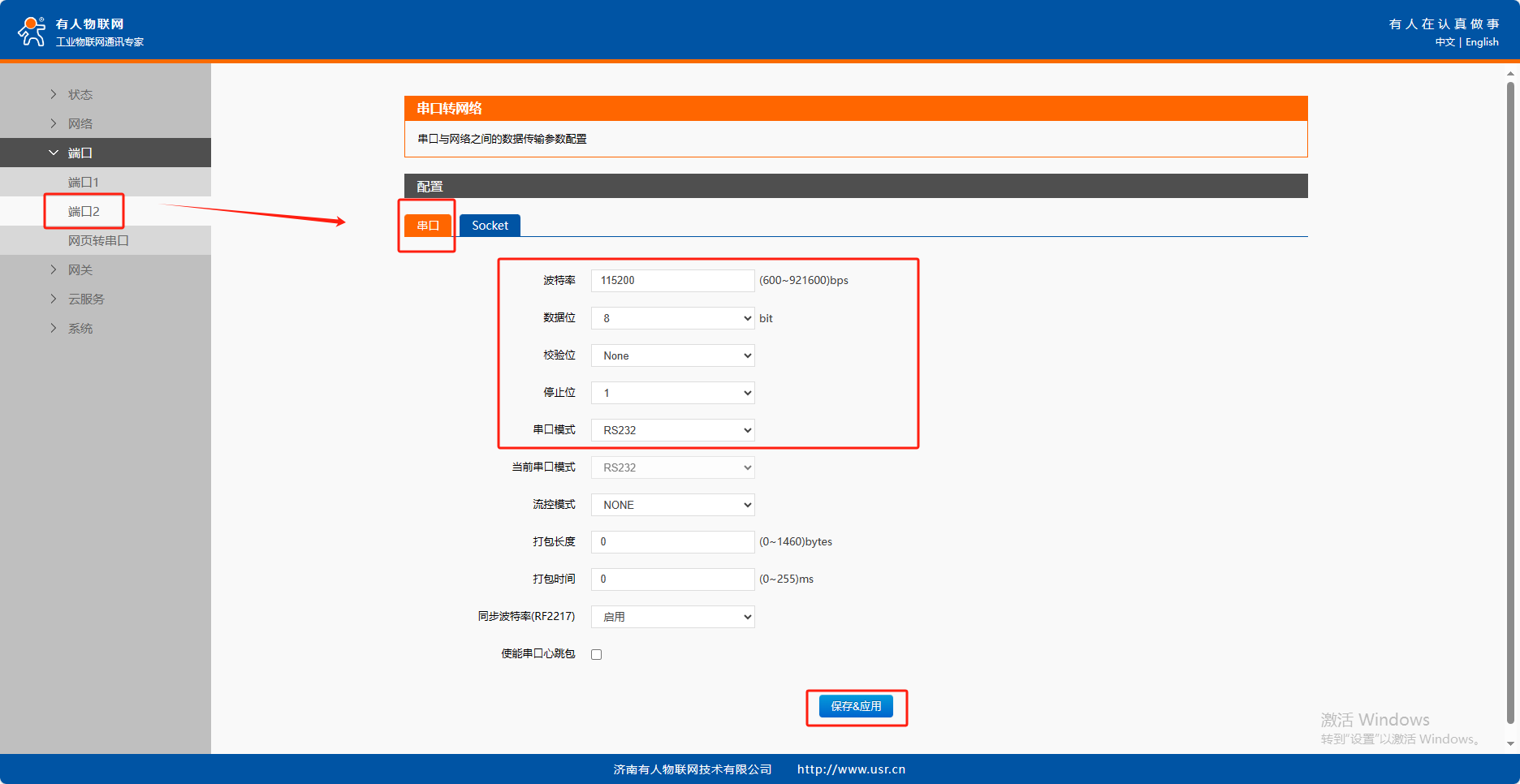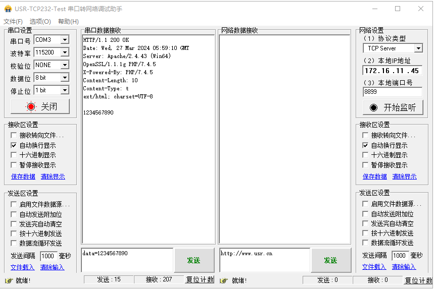 打開(kāi)正確的串口以及串口參數(shù),本例串口參數(shù)是USR-N520的默認(rèn)參數(shù):115200,N,8,1