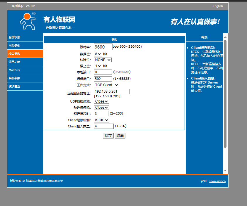 進(jìn)入內(nèi)置網(wǎng)頁,在端口參數(shù)配置界面,修改產(chǎn)品的串口參數(shù),串口參數(shù)需要跟串口所接的實(shí)際485設(shè)備做匹配。此案例以9600波特率舉例。將設(shè)備的工作模式為TCP client,遠(yuǎn)程服務(wù)地址配置電腦的ip地址,遠(yuǎn)程端口:502(可以自定義)