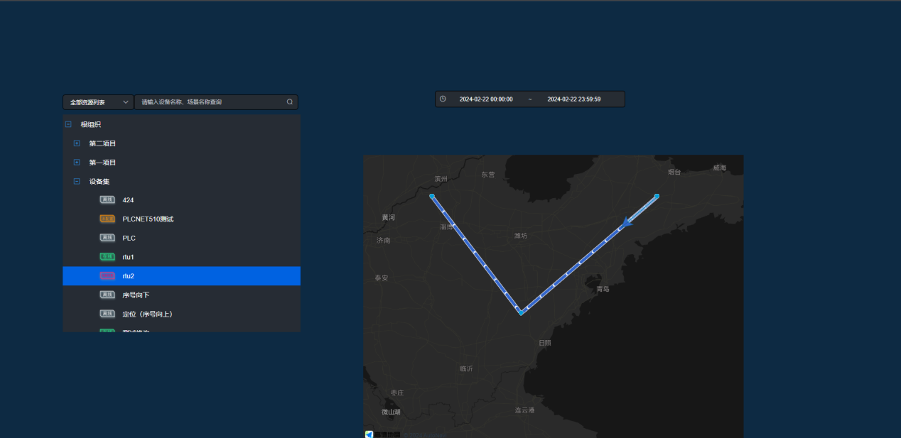 6、點擊組織結(jié)構(gòu)資產(chǎn)下拉框配置交互,單擊選中設備時控制軌跡地圖的數(shù)據(jù)聯(lián)動,字段與映射都是設備編號