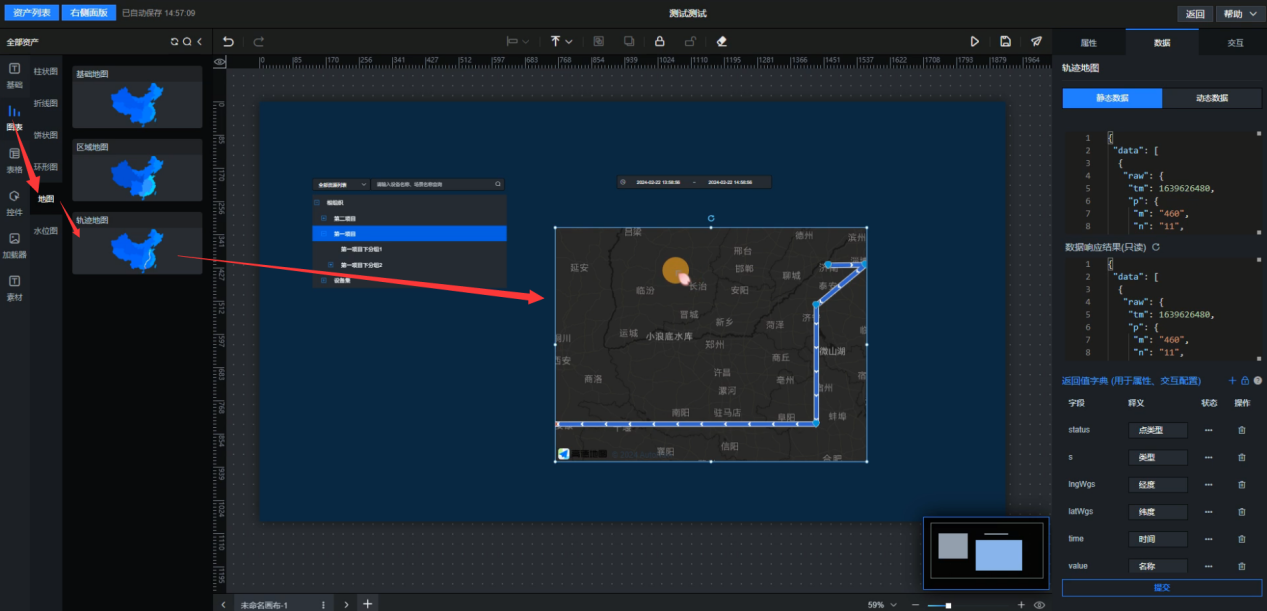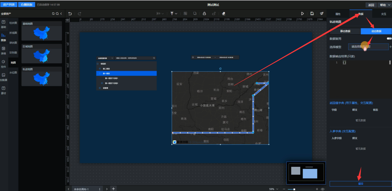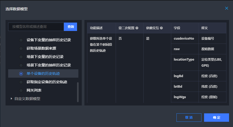 4、點擊地圖,在數(shù)據(jù)中綁定動態(tài)數(shù)據(jù),選擇“單個設備的歷史軌跡”數(shù)據(jù)模型