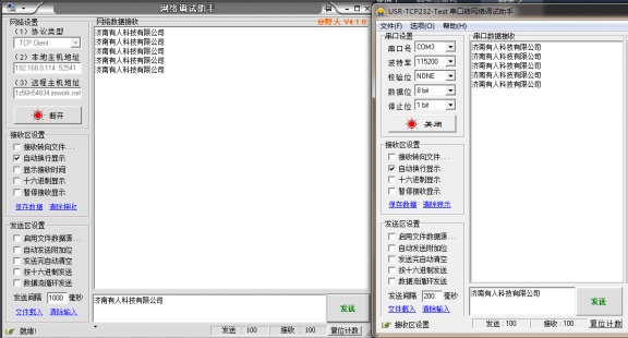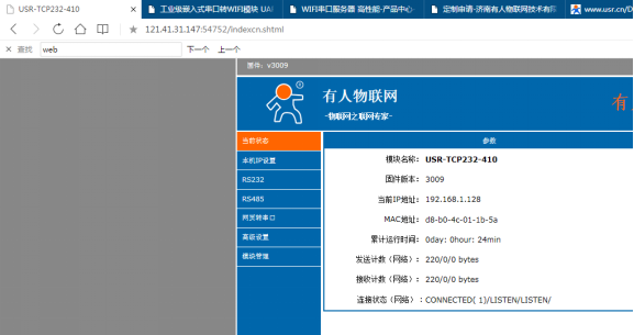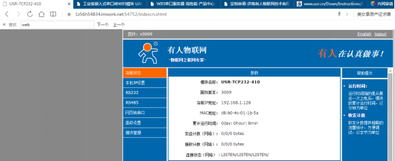 本文測試使用的網(wǎng)口設(shè)備為USR-TCP232-410S 實(shí)現(xiàn)的功能是訪問410S內(nèi)置網(wǎng)頁及連接410S的TCP Server透傳數(shù)據(jù)。410S的IP為192.168.1.128,網(wǎng)頁端口80,TCP Server監(jiān)聽端口23。
