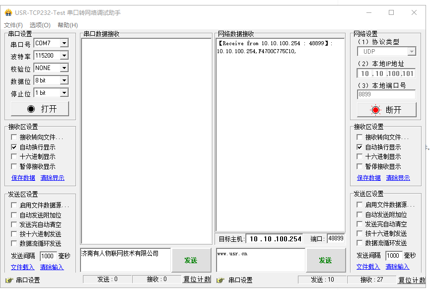 USR--WIFI232-B2 測試底板的485串口接USB-RS485串口線接電腦。