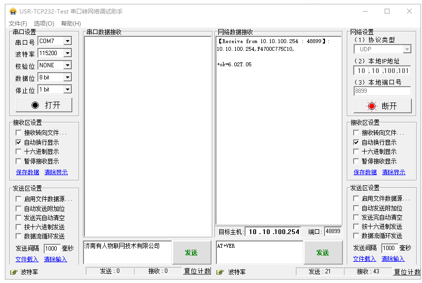 網(wǎng)絡(luò)數(shù)據(jù)接收到USR-WIFI232-B2的IP和MAC,收到IP和MAC后,立刻發(fā)送+ok(不帶回車發(fā)送),發(fā)送完就是進入網(wǎng)絡(luò)AT指令,可以發(fā)送USR-WIFI232-B2的AT指令,去查詢參數(shù)。