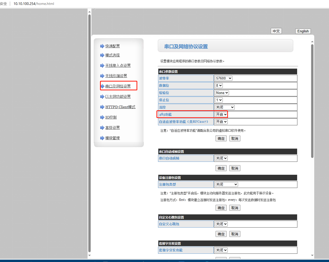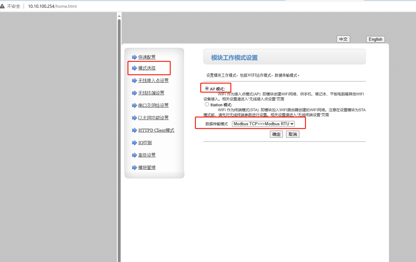 網頁上設置AP模式,開啟MODBUS TCP轉MODBUS RTU模式,點擊確定。