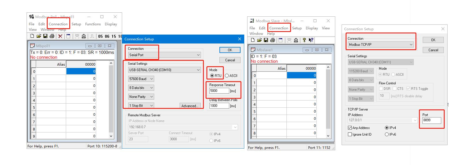 (2)Modbus Slave軟件,點擊Connection,選擇Modbus TCP/IP,Port端口8899。最后點擊OK。