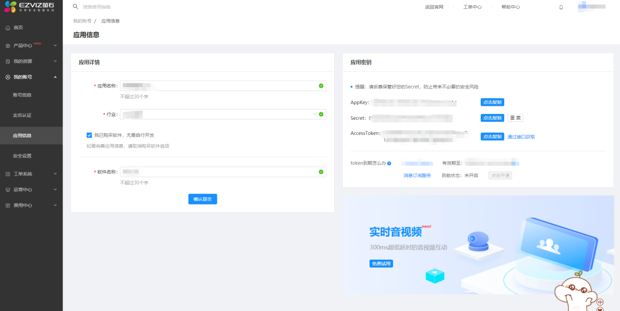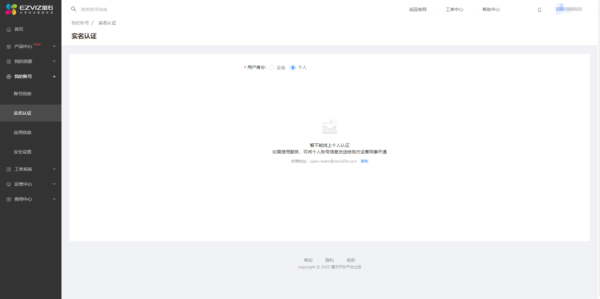 1、在瀏覽器打開螢石云的網(wǎng)址:https://open.ys7.com/mobile/download.html如果沒有螢石云賬號請注冊2、點擊創(chuàng)建應(yīng)用按鈕,需要進行實名認證公司認證和個人認證二選一即可。
