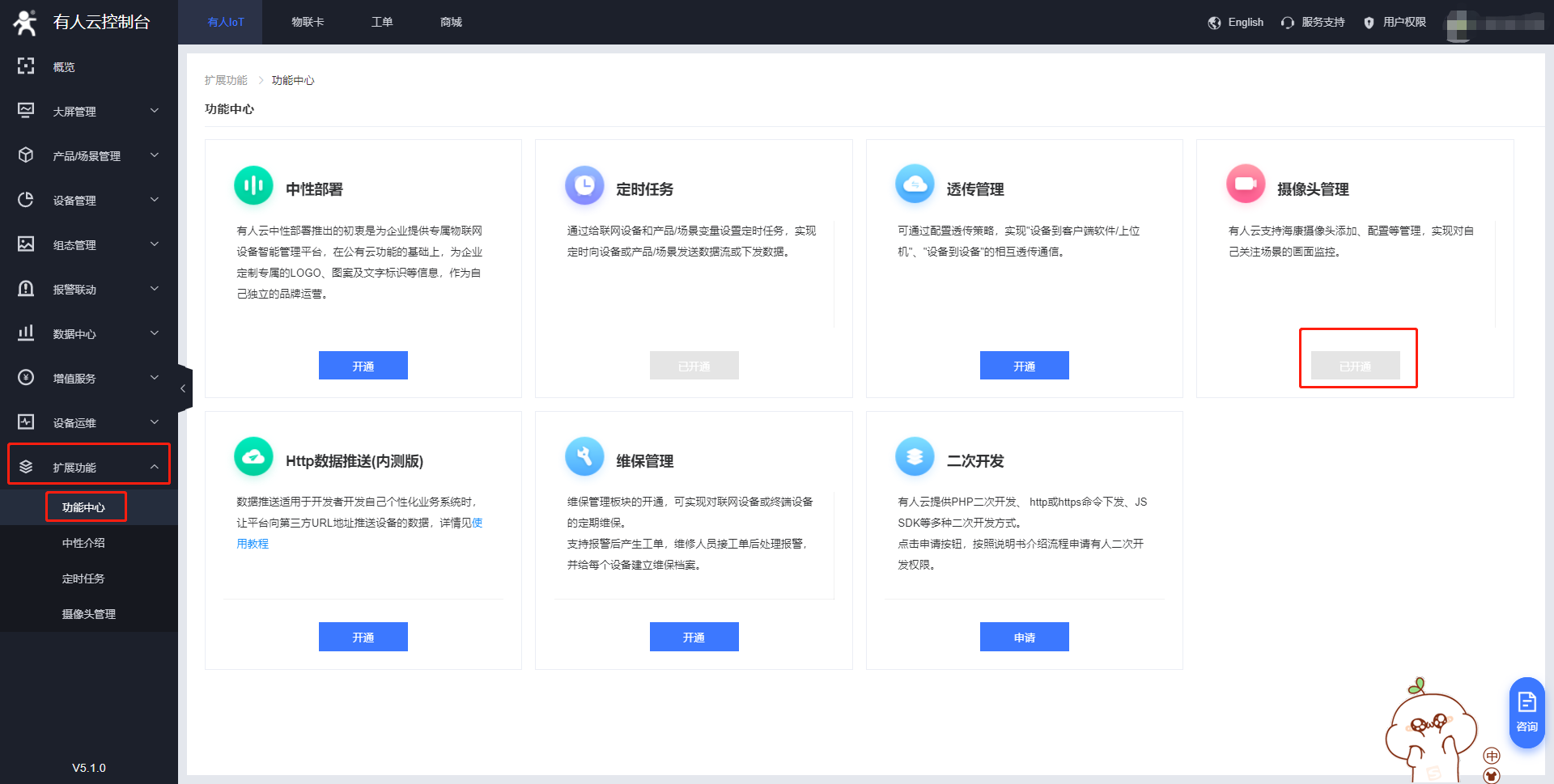 3、在擴展功能---功能中心將攝像頭管理開通,左側(cè)列表生成該項欄,點擊進入攝像頭管理