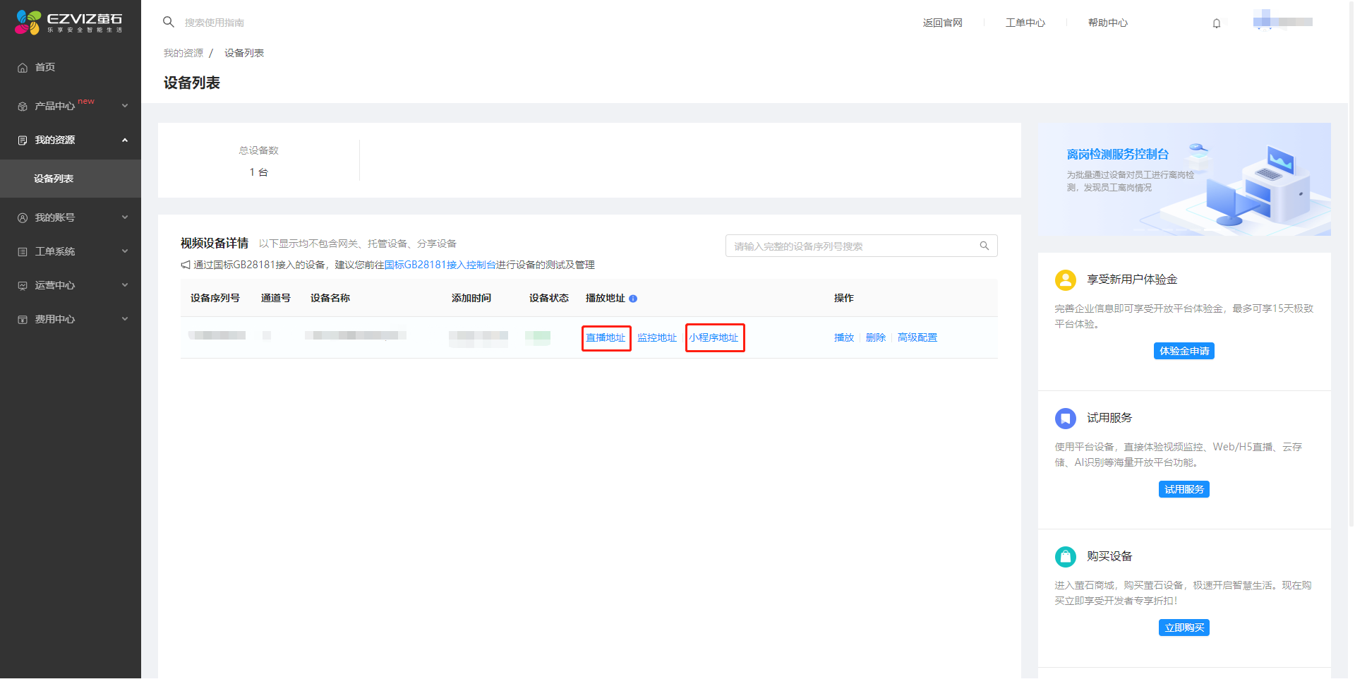 4、在我的資源---設(shè)備列表,添加??禂z像頭