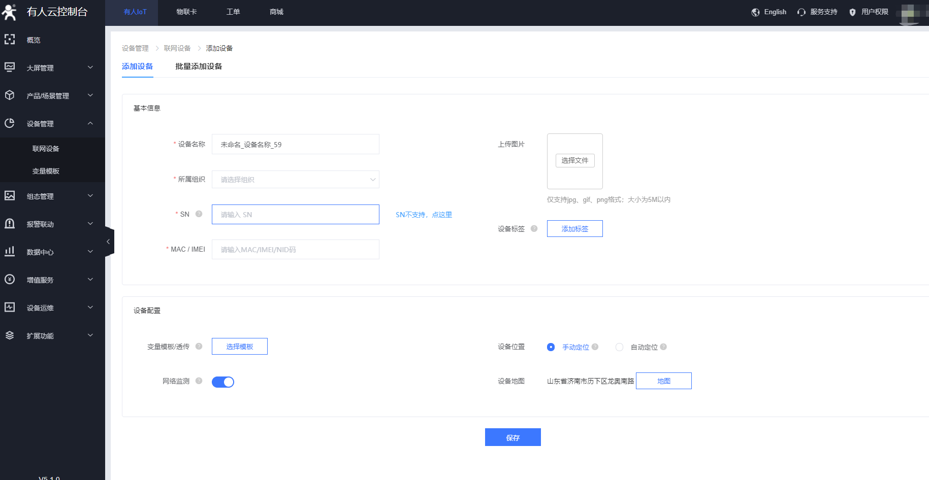 1、登錄云平臺后,在設(shè)備管理---聯(lián)網(wǎng)設(shè)備---添加設(shè)備