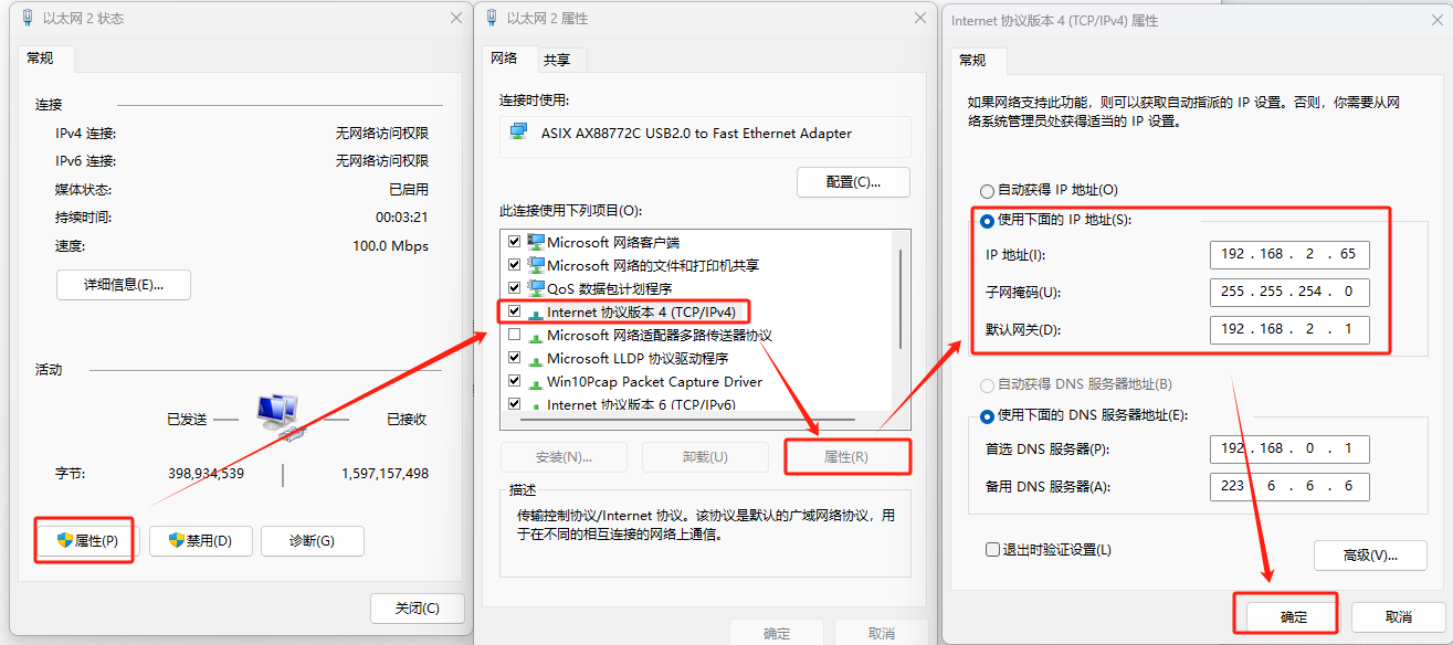 將電腦IP修改為靜態(tài)IP:192.168.2.65,子網(wǎng)掩碼255.255.255.0,網(wǎng)關(guān)修改為192.168.2.1